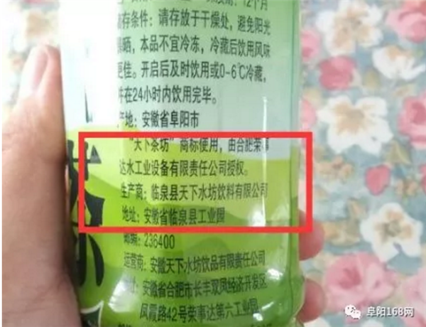 徐先生仔细看了看瓶身,才发现自己买的绿茶并不是市面上常见的品牌,只是在包装上比较像而已。这款绿茶名为天下茶坊,是临泉县一家饮料有限公司生产的,生产日期为2018年5月6日。