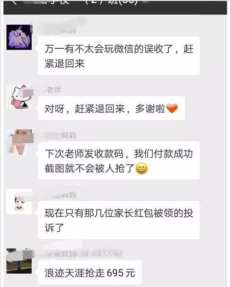 一开始,大家以为他只是不小心点错了,陆续发现好几位家长的红包都被他抢走,一共695元。