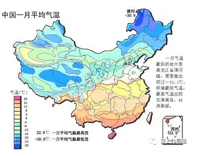 这是我国一月平均气温等温线图,温度主要的决定因素是纬度,同时也受海洋和海拔影响。所谓平均气温是每天多时间不同温度算出日均温,再把一个月的温度算出来月均温,然后通过多年平均值得出,所以有些月均温在0度以上的地区也会出现河流结冰啊下雪的现象,不是什么新鲜事儿,就跟班里平均分60分,但肯定有考90的也有考20的一样。可以看到图中红色那条线,就是我国一月平均气温0度的等温线。