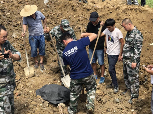 随后阜阳蓝天救援人员依靠铁锹、